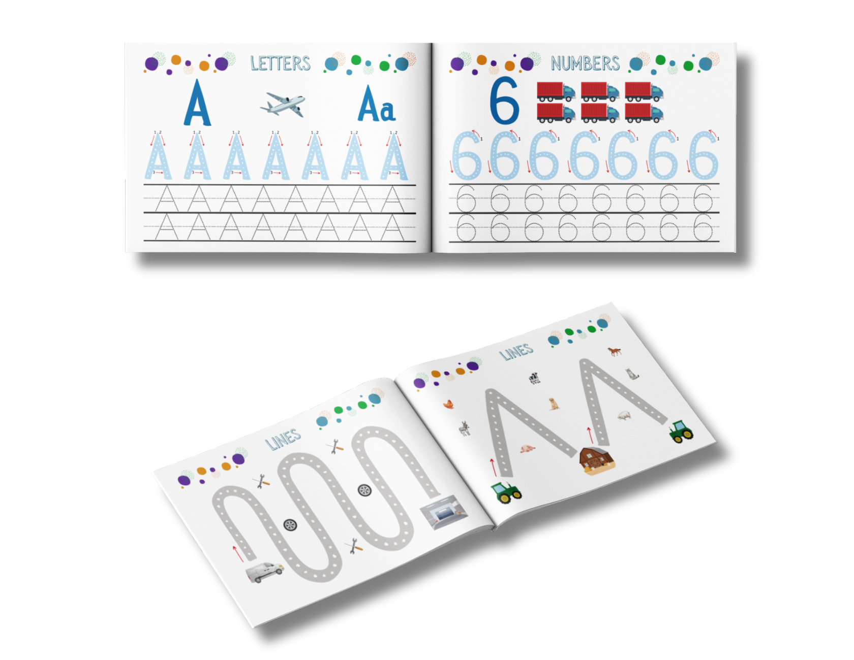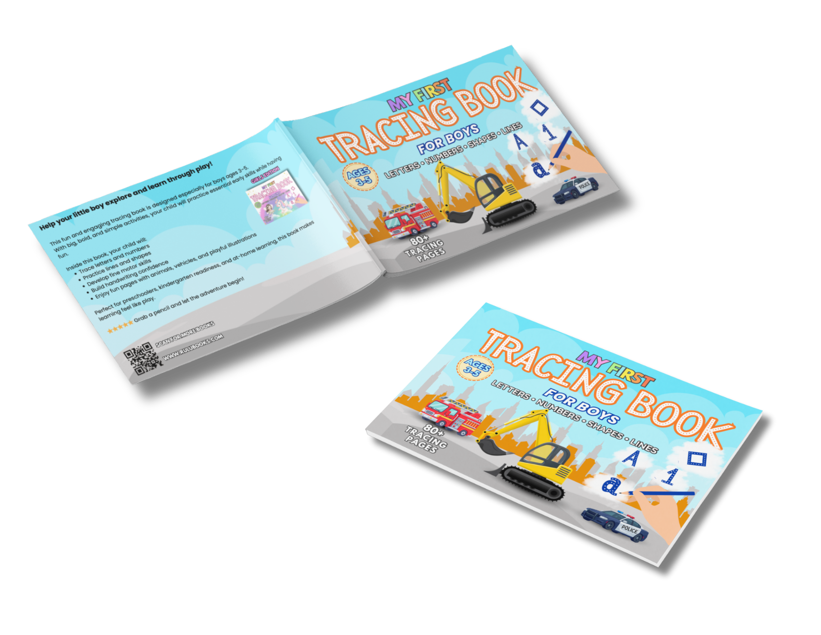 A full color tracing workbook for boys ages 3+ with easy lines, shapes, numbers, and letters to build early handwriting skills and pencil control.