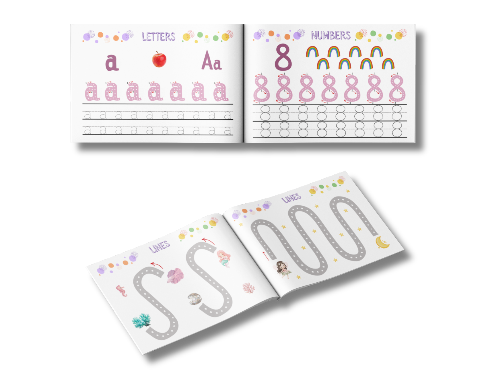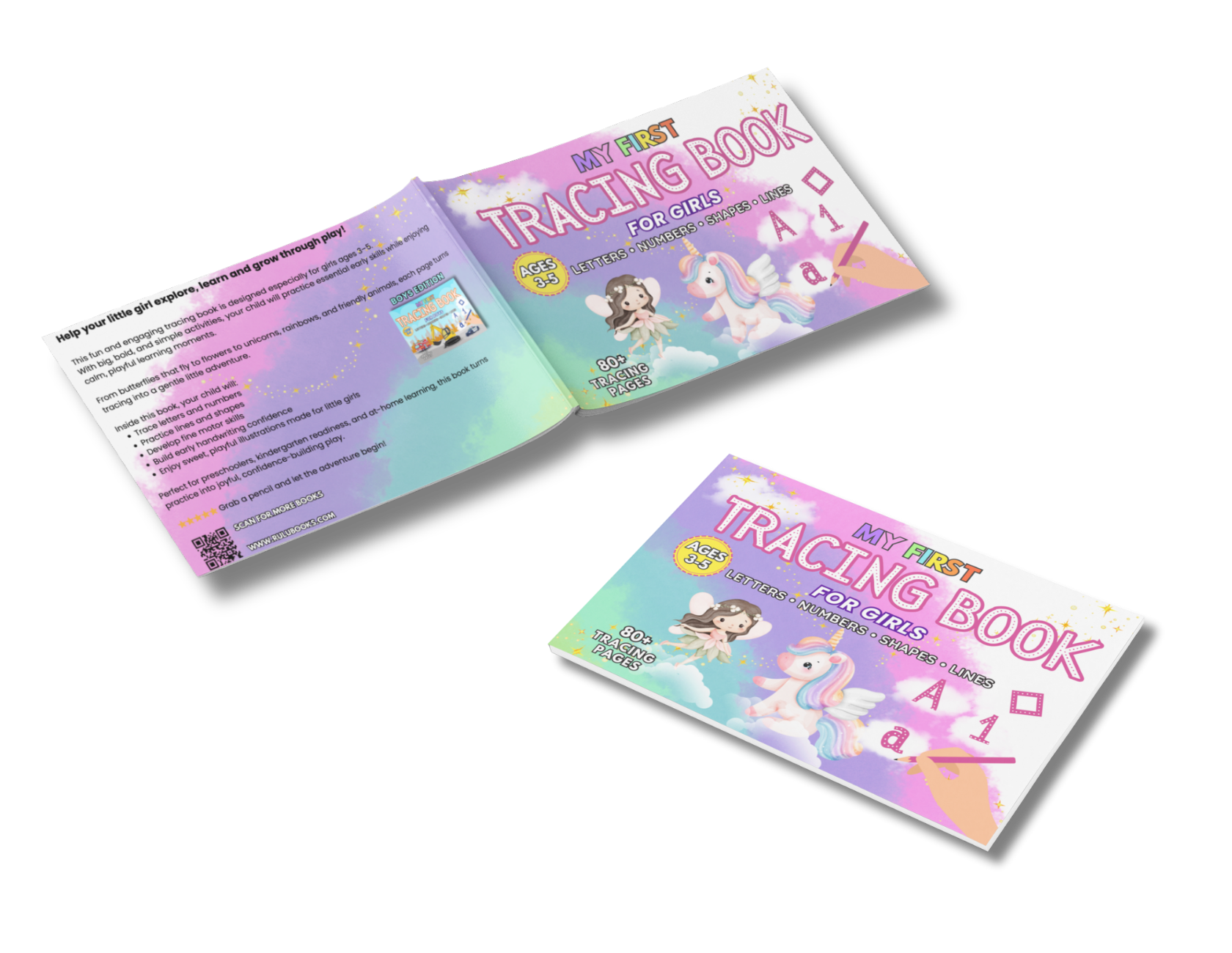 A full color tracing workbook for girls ages 3+ with easy lines, shapes, numbers, and letters to build early handwriting skills and pencil control.